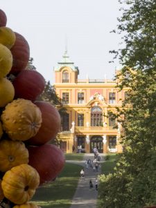 Auf der breiten Allee ging es zurück zur Hinterseite des Schlosses. Kleine Kunstwerke aus Sand und aus Kürbissen waren auf der Terrasse zu bestaunen. Zwischen den Kunstobjekten hinduch bahnten wir uns den Weg hinunter in Richtung Favorite-Schloss. Dort war der Kürbismarkt. Alle erdenklichen Sorten, in riesigen Kisten – und zum Teil die passenden Gerichte dazu. Kürbis in allen Varianten, auch Öle, Chutneys, Brotaufstriche, Kürbis gekocht, gegrillt, gebraten sogar einen Kürbisbrand gab es. Es war schon beeindruckend. Auf diesem Markt, mit dem Favorite-Schloss im Blick, haben wir uns dann von Frau Abredat verabschiedet. Es war ein gut gelungener Nachmittag.